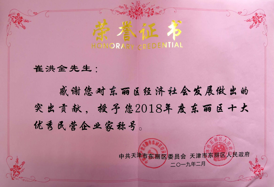 安达集团党委书记、董事长崔洪金荣获2018年度东丽区十大优秀民营企业家并颁发证书。